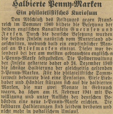 Die auf den Inseln geltenden Briefmarken von Großbritannien blieben jedoch auch nach der deutschen Besetzung für die Zivilbevölkerung in Verwendung. Im Jahre 1969 bekam das Postwesen der Inseln Jersey und Guernsey eine eigene Posthoheit und wurde somit selbständig.