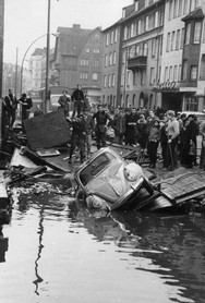 Man musste jederzeit damit rechnen, keinen festen Boden unter den Füßen zu haben, weil z.B. Sieldeckel oder Gehwegplatten weggespült wurden. Ich löste das Problem, indem ich den Gehweg vor mir mit einem Besenstiel abtastete.
